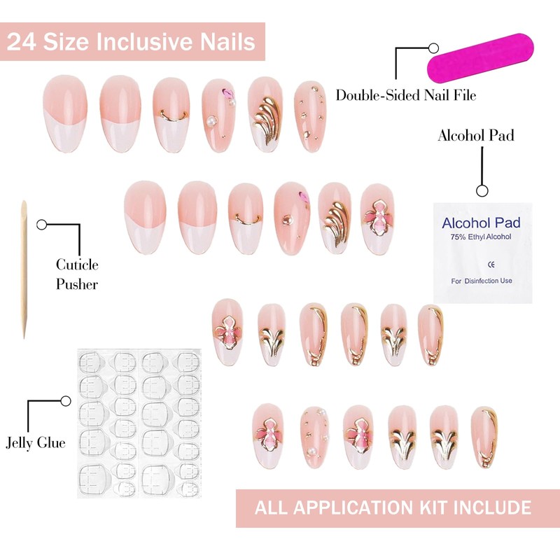 Package Contents: 24pcs false nails,24pcs Jelly glue, 1pc wood stick, 1pc mini nail file, 1pc alcohol pads.
