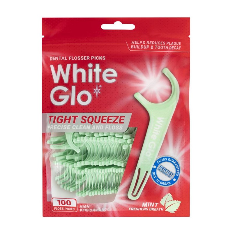 White Glo Tight Squeeze Floss Picks Mint gives a precise clean and floss, helping to reduce plaque build-up and tooth decay.