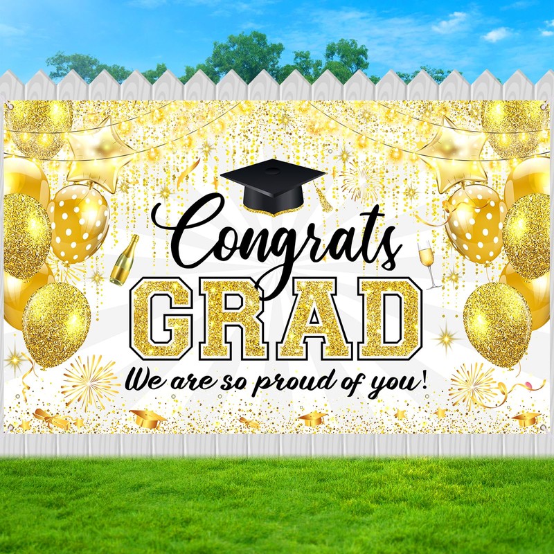 - 【White Gold Graduation Banner】: The 2025 congrats grad backdrop banner is printed with glitter gold balloons, beautiful fireworks, eye-catching " Congrats Grad" and “We are so proud of you”writing, easily create a joyful atmosphere for graduation