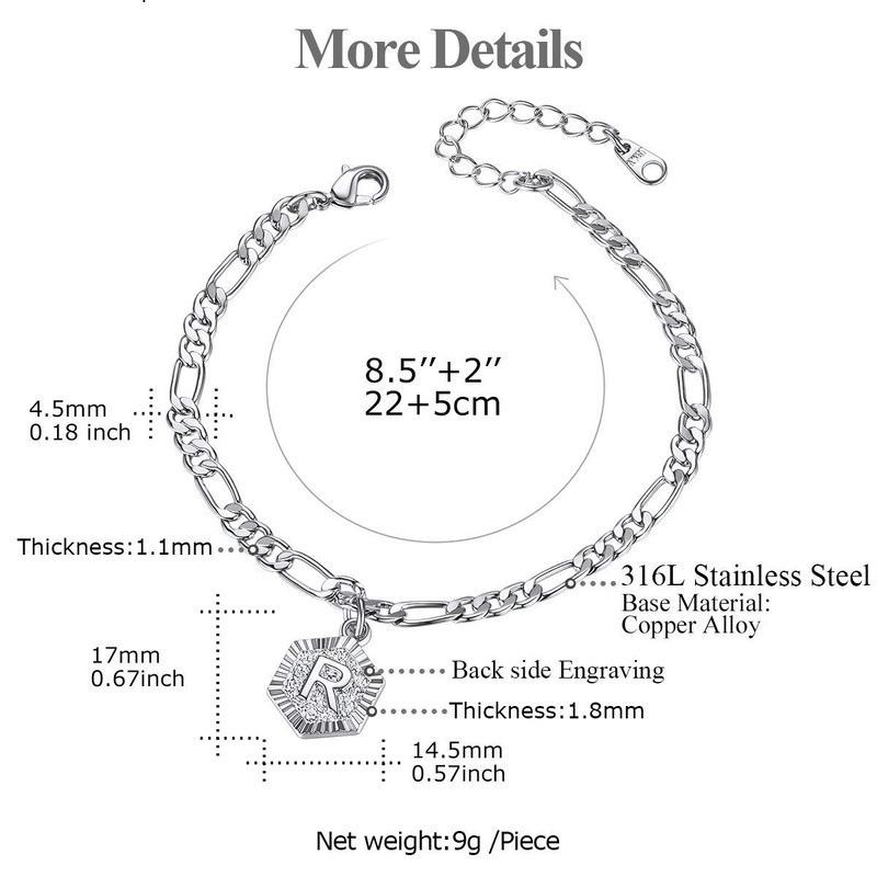 White Gold Plated Flat Figro Chain Link Anklet for Men Women with Initial Letter Charms(R)
