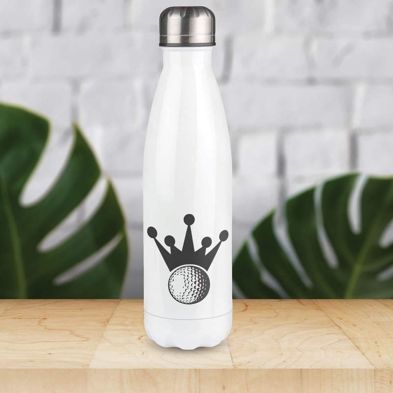 Waterproof screw top lids Take your drink with you wherever you go. This on-the-go thermos will take you with you without losing a drop of the contents. Our Mygoodprice water bottles hold up to 500 ml. The colour white printed with the motif "Courrone Golf", except the cap is brushed aluminium.