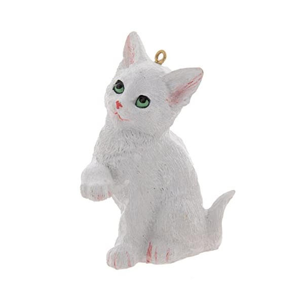 - Product Description: Decorate the purr-fect tree this holiday season with this White Kitten Ornament! This classic resin ornament depicts a young cat with a white color, textured fur details, pink color on the paws, ears, and nose, and big green eyes looking upwards. The kitten is sitting and striking a cute pose with a tilted head and a single paw raised. Take its included metallic gold thread and hang it up from your Christmas tree for festive decor cat lovers will adore!