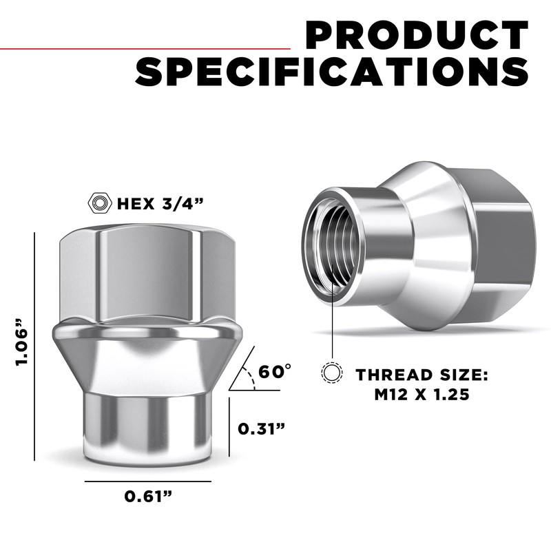 - Specifications: M12 x 1.75 Thread Pitch, 1.06” Overall Height, 0.61” Base Diameter, 0.31” Shank Length, 3/4” Hex, 60-degree Conical Seat.