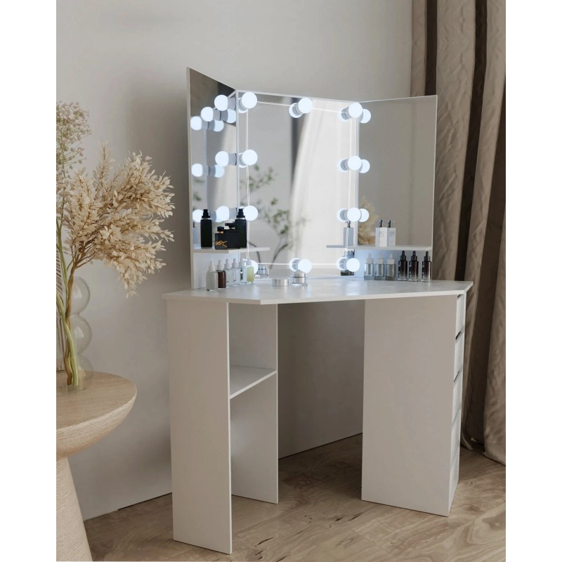 White Makeup Corner Vanity Desk with LED Mirror & 3 Lighting Modes Adjustable US