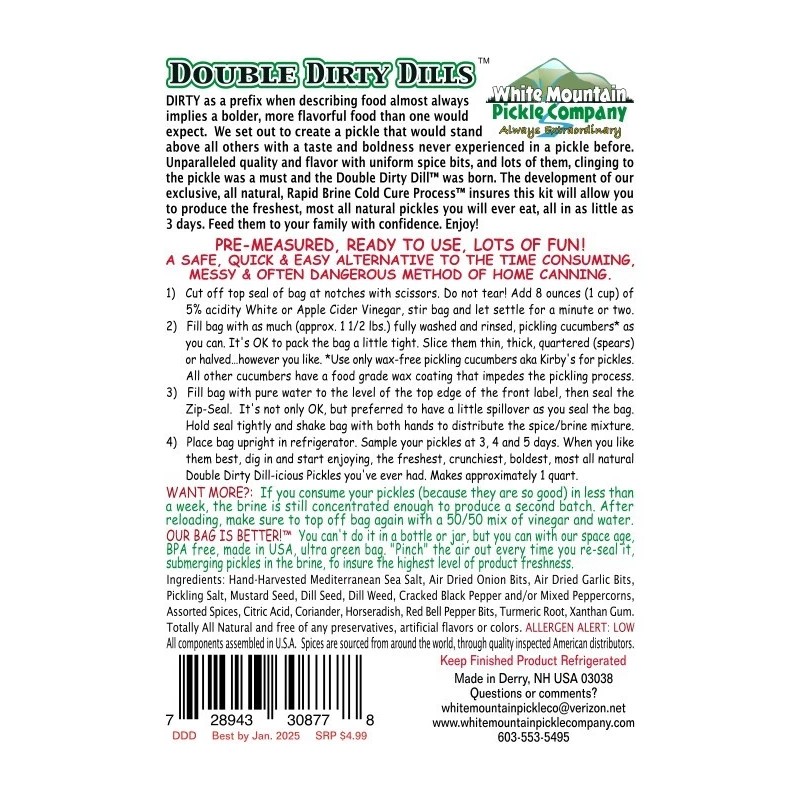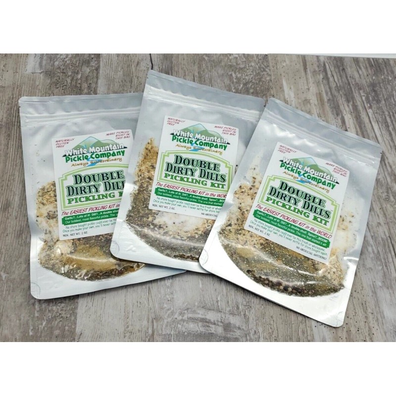 A Triple Threat of Double Dirty Dills from White Mountain Pickle Company. White Mountain Pickle Company's #1 Flavor! Bursting with a generous blend of garlic, dill, and spices, this kit takes pickle flavor to a whole new level.
