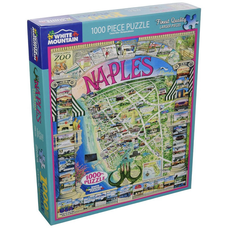 Located on the Gulf Coast south of Ft. Myers, Naples, Florida is famed for its balmy winter climate, white-sand beaches, luxury hotels, great restaurants, and boutiques. Naples also is home to an extraordinary variety of golf courses and golf communities. Alligator Alley runs right through it on the way to Fort Lauderdale. The center of the puzzle features a road map with the location of things to do and places to see. Along the perimeter are vignettes showing places to stay, from the Super 8 to posh resorts along with popular attractions like Tin City, The Naples Museum of Art, The Caribbean Gardens Zoo, Everglades Excursions, and more. If you are planning a trip and looking for things to do in Naples, FL, plan ahead and let this jigsaw puzzle guide the way! The fantastic Naples Florida is the work of artist David Harrison. Art jigsaw puzzles are a fun and inexpensive way to enjoy beautiful works of art firsthand. Jigsaw puzzles are also used to boost cognitive skills; develop hand-eye coordination, fine motor skills, problem solving, shape recognition, memory, and task completion. The White Mountain Puzzles – Naples Florida includes 1,000 unique interlocking pieces made of sturdy blue chipboard on recycled paper. Extra large sized pieces for easy handling. Puzzle dimensions (completed): 24 x 30 inches. Every White Mountain Puzzle is proudly manufactured in America with a 100% customer satisfaction guarantee.