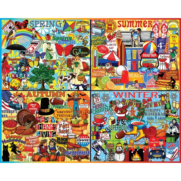 - SEASONS CALENDAR: Never miss a favorite holiday again! From Independence Day to Halloween to Christmas to Easter and Spring Break, this 1000 piece jigsaw will help you never forget an important date again because it has them all in one!
