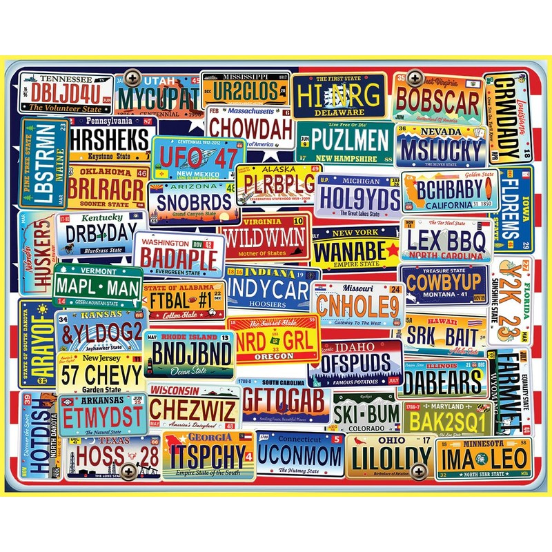 - WHIMSICAL LICENSE PLATES: The "Vanity Plates" 1000 piece jigsaw puzzle by White Mountain offers a collection of 50 different license plates, each representing a state in the United States. These plates feature clever & amusing wordplay or phrases, guaranteed to bring a smile to your lips as you piece them together.