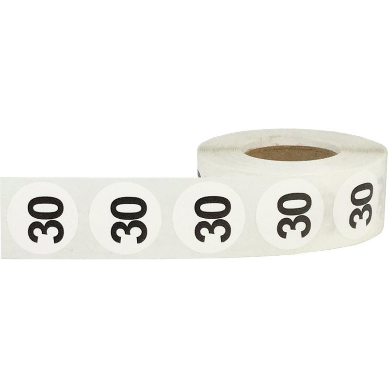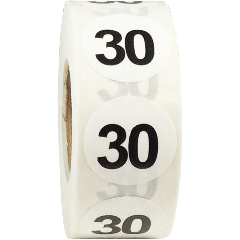 White Number 30 Stickers 0.75 Inch 19 mm Round 500 Count