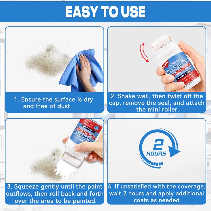 • Easy to Use - Achieve professional results effortlessly with easy-to-follow instructions. Ensure the surface is dry and dust-free. Shake well, remove the white cap, unscrew the roller and connector, remove the seal, then reattach the roller and connector securely. Squeeze gently until the paint flows, then roll over the area. If needed, wait 2 hours and apply additional coats to enhance whiteness