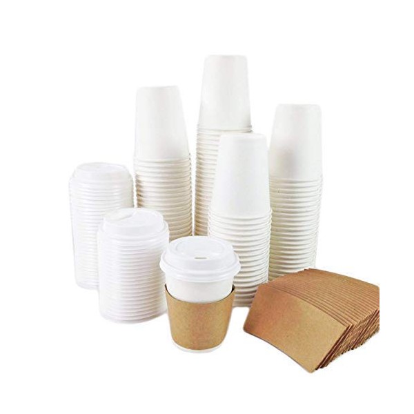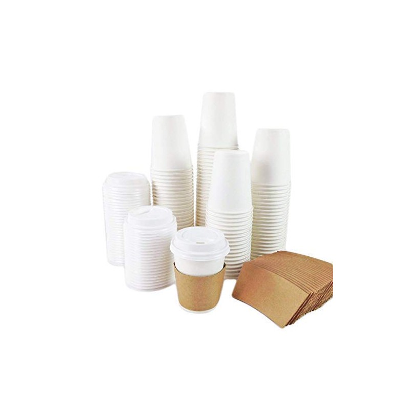 White Paper Cups for Hot Drinks | Coffee Cups with White Thru Lids and Sleeves 8oz (227ml) (500)
