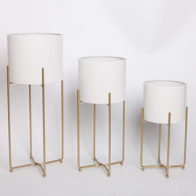 White Planters with Gold Stands for Indoor Plants, Large Metal Flower Pots Set of 3, Tall Floor Standing Planters for Mid Century Modern Living Room, Corner, Patio (Diameter 98 inches)