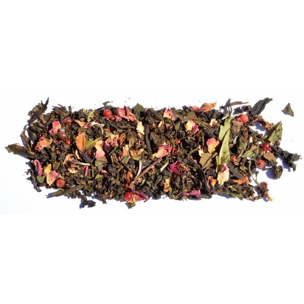 Relish in the sweet taste of pomegranate, berries, and roses through this white tea. Contains low caffeine. Made fresh to order! Ingredients: White Tea, rose hips, roses, red pepper berries, flavoring. Steep 1 Tablespoon in 8 oz cup of hot water (212 degrees) for 5 minutes. This is a loose leaf tea blend. You will need a steeper, tea ball or fold-over tea bag to prepare this tea.