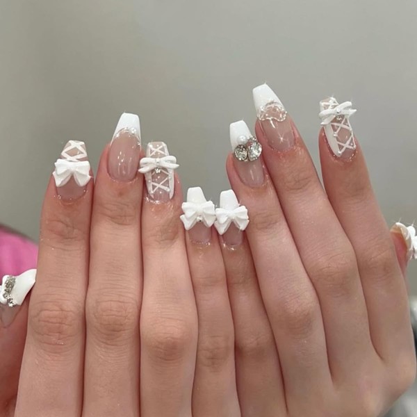 White Press on Nails Coffin Fake Nails Medium Nails Press ons with 3D Bow Des...