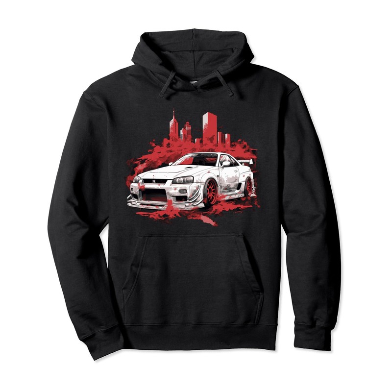 White & Red GT R 34 Skyline JDM Car Lover Pullover Hoodie, black