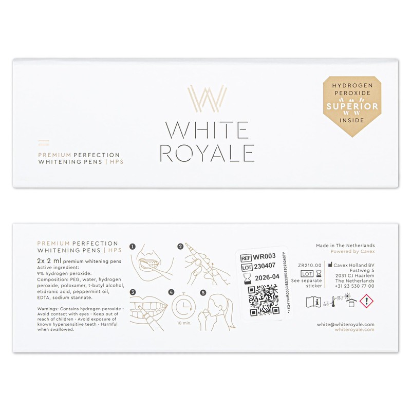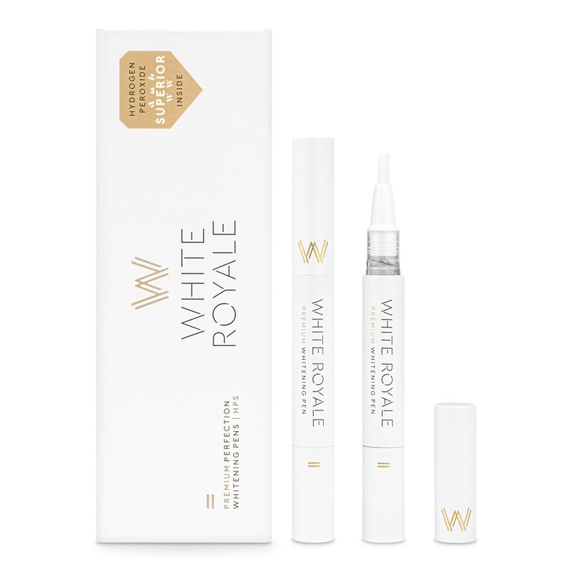 - White Royale Premium Teeth Whitening Gel Pens contain 9% Hydrogen Peroxide Superior Formula for immaculate whitening results.