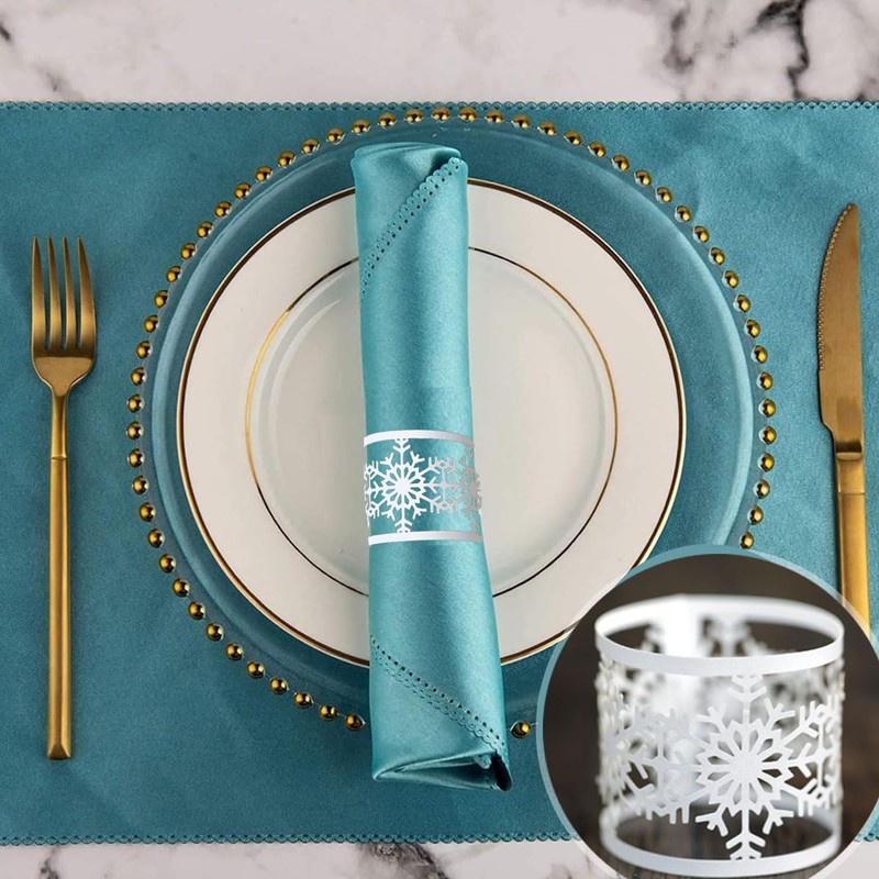 - Material: The white napkin rings are made of laser-cut pearlescent paper, and there are 60 reflective craft napkin rings to choose from. When unraveled, insert the tab on one side of the strap to the opposite side. After insertion, it forms an annular interlocking seal.