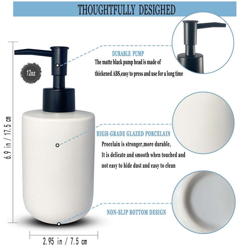 - -Matte Glazed Porcelain:This liquid soap dispenser is made of high-quality pottery clay after high temperature firing.The bottle body is coated with matte glaze,which is makes the product look more premium,and easy to clean.