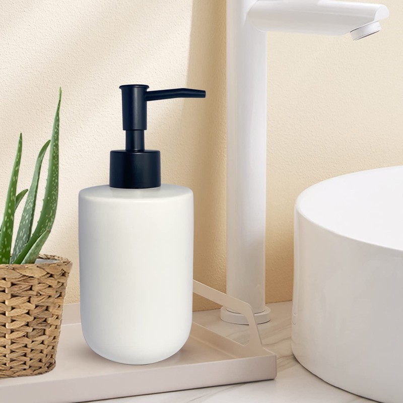 White Soap Dispenser with Matte Black Pump for Bathroom,Minimalist Modern Design Cylindrical Lotion Dispenser,12oz Ceramic Hand Dish Soap Dispenser,Refillable Liquid Dispenser for Kitchen (White)