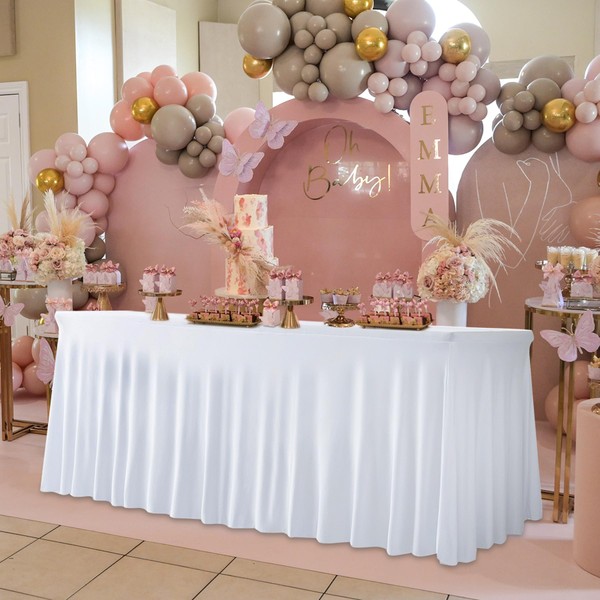 - Easy to setup. Fitted table cloth fits to 6 ft standard foldable rectangular 6 foot tables. No assembly or any additional velcro or pegs needed. Just pull it over the banquet or trade show craft table and enjoy. The natural drooping ruffles will be the perfect addition to your event. Our stretch table cover always brings a neat and elegant look to your table and hides all supplies which you prefer to hide under the table.
