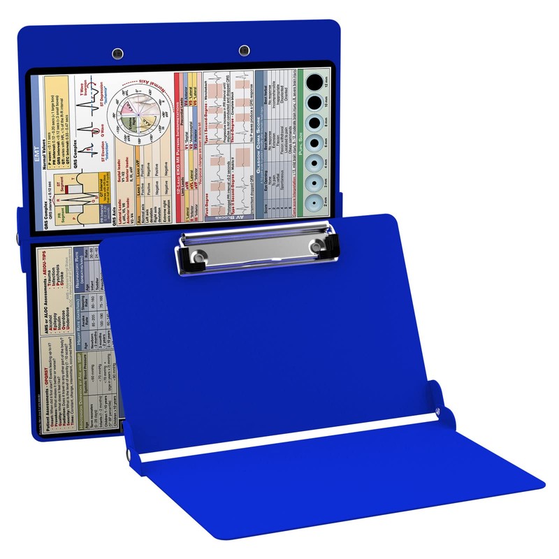 An essential resource, this handy folding clipboard is a great field reference specifically designed for EMT's and First Responders. You can now take patient assessments on a solid writing surface and then fold up your clipboard for storage, or slide in a scrub pocket. This is one-of-a-kind patented full size folding clipboard contains medical information on burns (rule of nines, body surface area), pain scale, sepsis definitions, common labs and conversions with vital signs for infant to adults. Use the medical information on this clipboard to help you diagnose AV blocks, ST elevation, pupil size and much more.