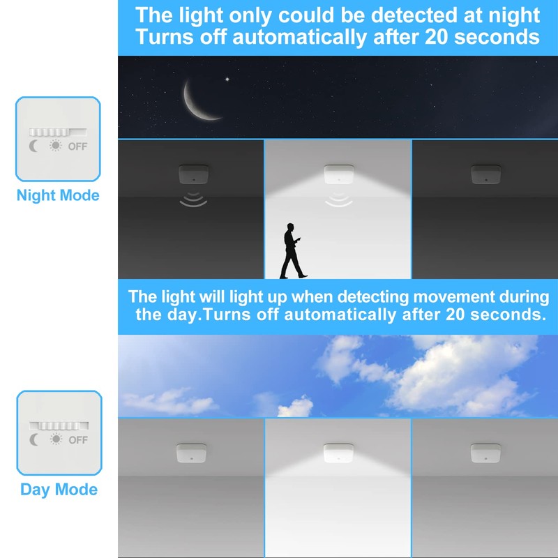 - 2 Modes - In [DAYLIGHT] Mode, the light is active all day, responding to movement. The motion detector automatically turns on within 9-16 feet and turns off after 20 seconds of no motion. Switch to [NIGHT] Mode, activating the light in low-light conditions. It won't turn on if enough ambient light is detected. Enjoy the convenience of this versatile rechargeable motion sensor light