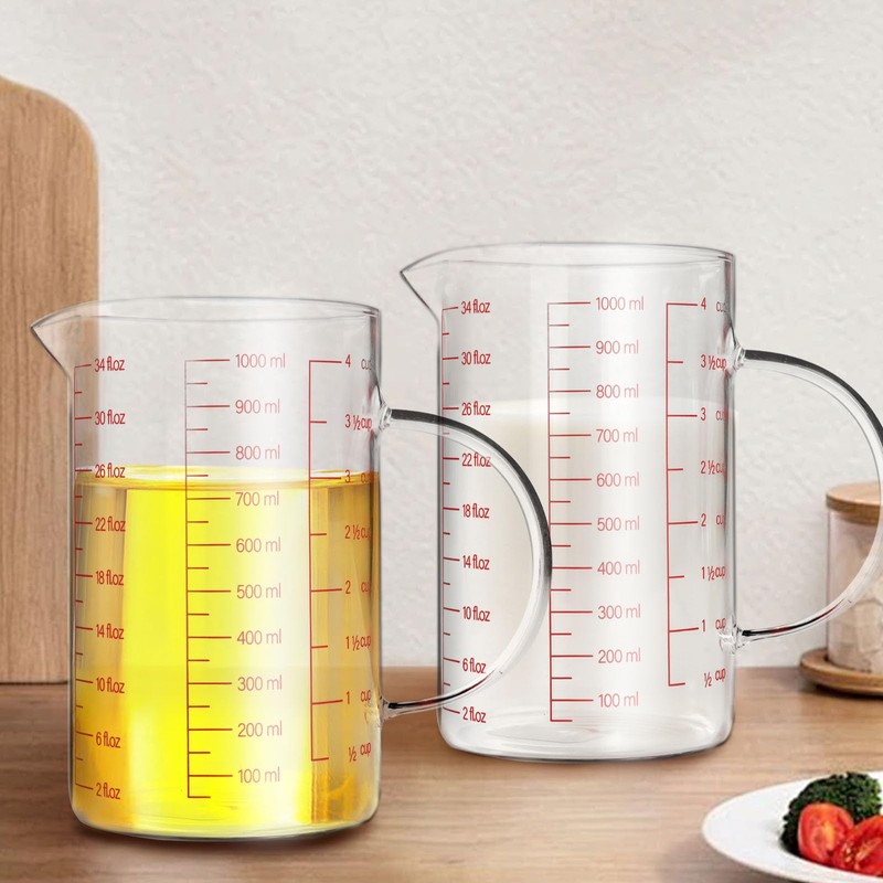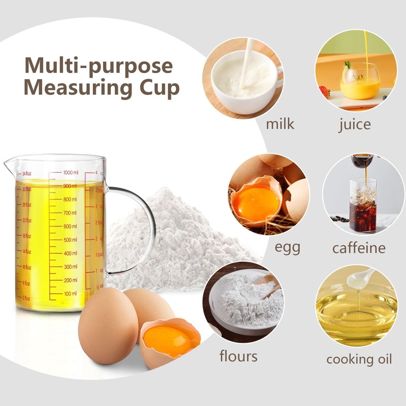 - 【Essential Kitchen Tool】4cup/1000ml/34oz measuring cup with multiple measurements (cup, ounce and milliliter).The measuring cup is lightweight, making it easy to handle and reducing the strain on your wrists, so the measuring cups that are perfect for baking, cooking, mixing and more!