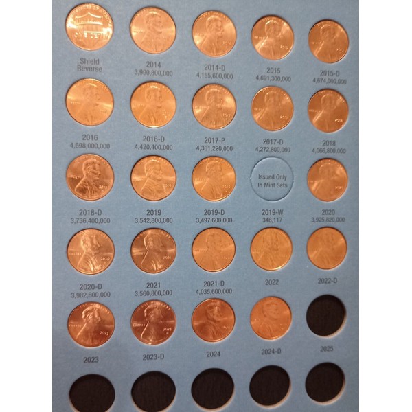 This product is a complete set of Whitman Lincoln Cents Coin Folder starting from 2014, Volume 4, Model 4004. It includes a board book format folder with blue color and English language. The set covers coins from 2014 to 2024 and is published by Whitman Publishing LLC. The product is brand new and has not been modified.