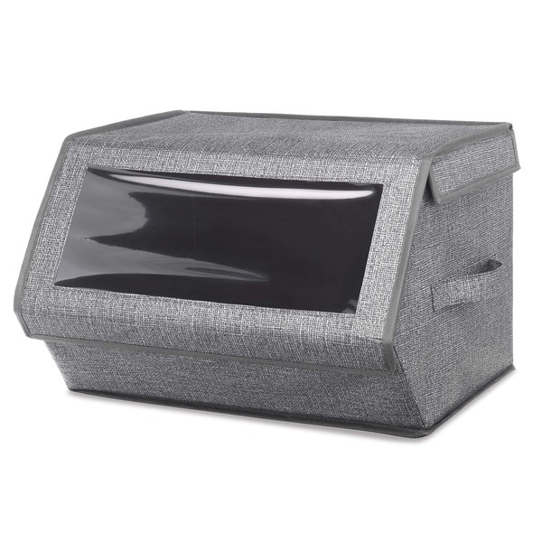 Whitmor 6283-7045, stackable window box, from the crosshatch collection has a see-thru window so you can see inside the box without unstacking or taking a lid off. The boxes have solid sides and sturdy bottoms, and so they can be stacked on top of the other. Each also has a lift-up front with magnetic closure that makes for easy packing and unpacking. Turn chaotic closets into havens of accessible tranquility. Keep common rooms neat and tidy. With the see-thru window you see what is inside and always grab the box you need, saving time, mess, and energy. This makes finding things much easier, and cuts back on time spent labeling.