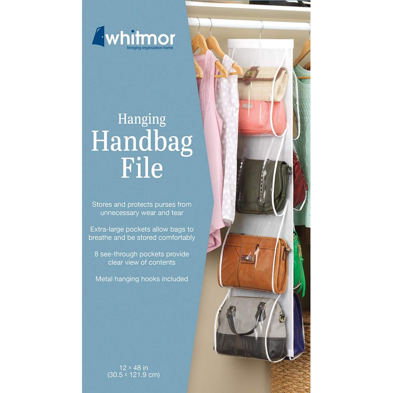 - The handbag organiser has a 360 degree rotating hook that can be hung on a standard closet rod. This wallet holder has transparent plastic slots that allow easy identification of contents. For storage, organisation and protection of handbags and accessories. For over 70 years, Whitmor has been bringing organization home. If you have any questions or problems, please contact us for immediate help