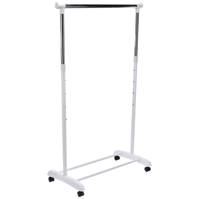 - Garment rack with a durable white epoxy coated metal frame with a chromed hanging bar.