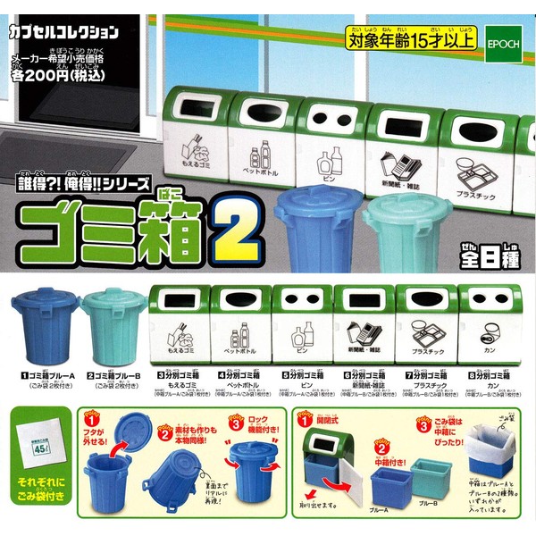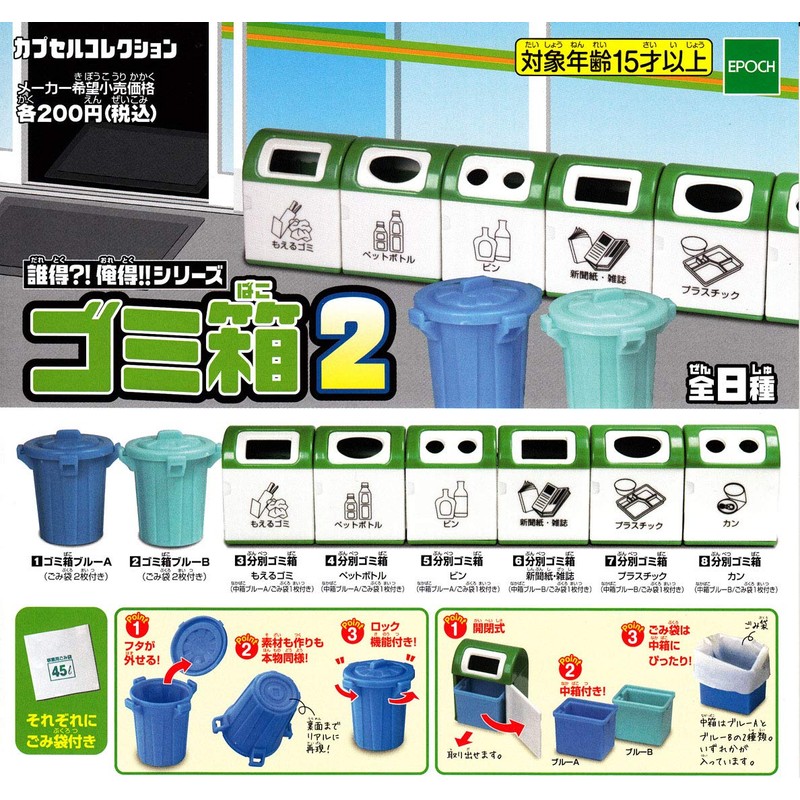 From Epoch company's popular capsule toy "Capsule Collection", the trash can is reintroduced in new colors. The blue trash can has a lid that can be removed and locked. The material and construction are just like the real thing. The separate trash can can can be opened and closed. All come with a trash bag made of the same material as the real thing!
