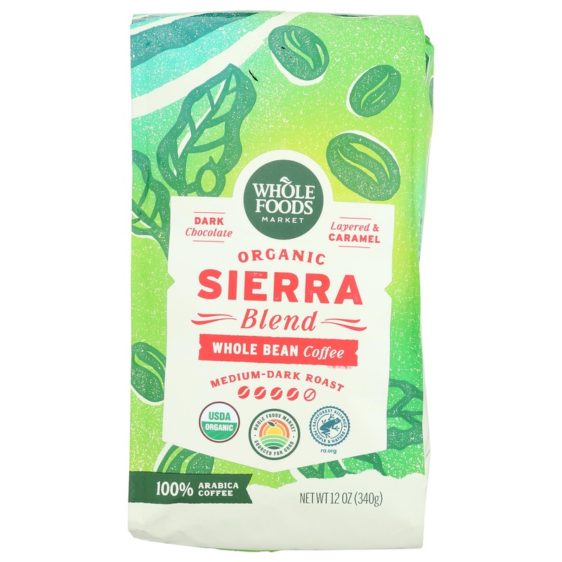 Whole Foods Market, Organic Sierra Blend Whole Bean Coffee, Medium-Dark Roast, Dark Chocolate & Caramel, 12 Ounce