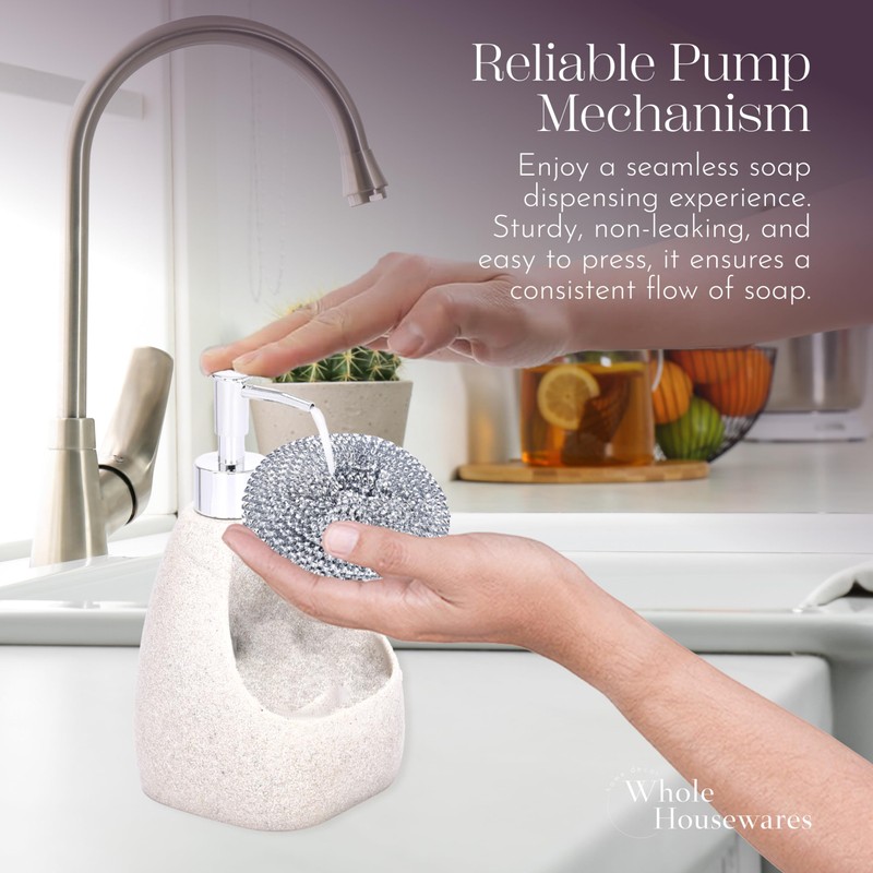Whole Housewares Elegant Dish Soap Dispenser with Integrated Sponge Holder - 7" x 4.3" - Premium Rubber Pump and Organizing Caddy - Beige