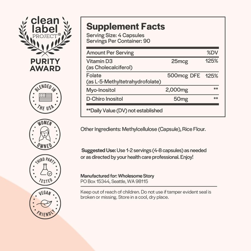 Wholesome Story Myo-Inositol & D-Chiro Inositol Capsules with MTHF, Folate, Vitamin D | Support for Ovarian Function, Hormone Balance, & Homocysteine Levels | Fertility Supplements for Women | 360 Count 40:1 Ratio