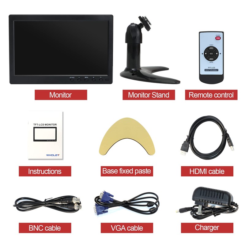 WHOLEV Security Monitor 10.1" CCTV Monitor 1024x600 FHD PC Monitor with VGA HDMI BNC AV USB Input Built-in Speaker 178° Wide Angle for Raspberry Pi Game Computer Monitor
