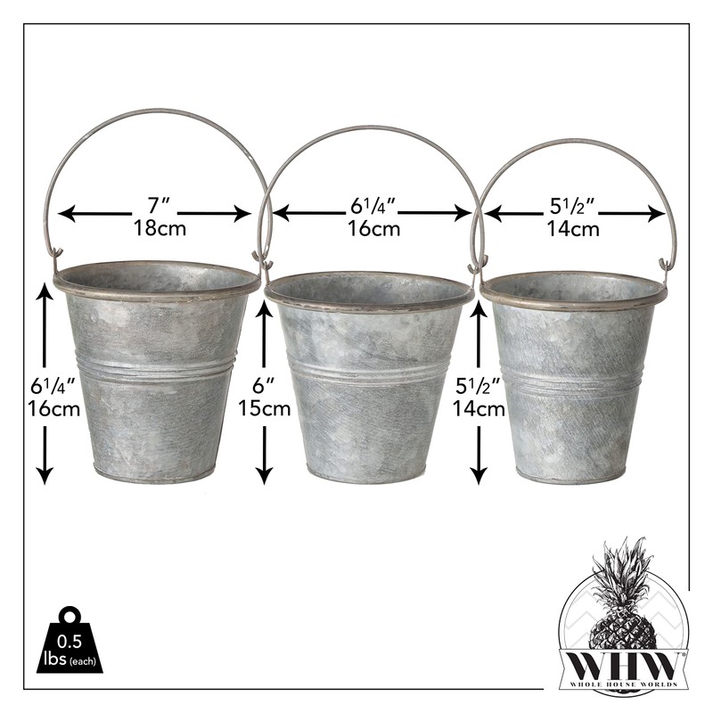WHW Whole House Worlds Farmhouse Metal Planter or Flower Pots, 3 Piece Set, Galvanized Zinc, Bucket with Handle, Country Style, 6 Inches Nesting, Corrugated Details