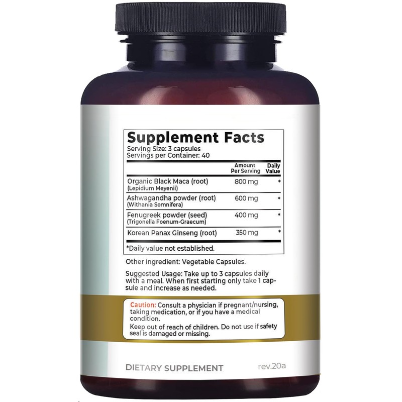 - PURE FORMS: Organic black maca is considered the most potent as it is higher than other forms in beneficial compounds, Panax ginseng is the most studied and potent variety, and we use pure traditional Ashwagandha root powder and fenugreek powder from ground fenugreek seeds.
