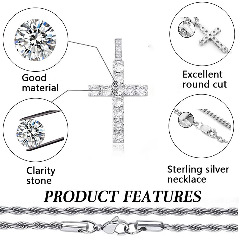 WHYCNJL 1 Piece Cross Chain Men's Women's Cross Necklace Stainless Steel Men's Necklaces with Zirconia Cross Pendant Chain Retro Rapper Stainless Steel Chain Silver
