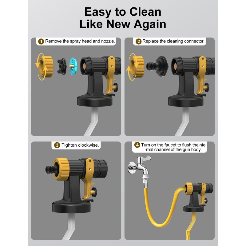 • 【Easy to Use & Clean】This paint sprayer features tool-free assembly in one second, even for beginners. Clean effortlessly: Detach spray head & nozzle, replace the cleaning connector, flush under faucet. Includes brush and unclogging needle for spotless results every time.