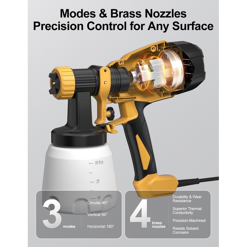 The WIBENTL Paint Sprayer unlocks professional results with 3 patterns (horizontal/vertical/circular) & 4 brass nozzles (1-3mm)—dial in perfect flow via adjustable knob to eliminate overspray. Features tool-free 1-second assembly, easy to Use & Clean, plus built-in air nozzle for dust blasting. Master indoor/outdoor projects (walls, trim, doors, furniture) using latex, acrylics, or stains.