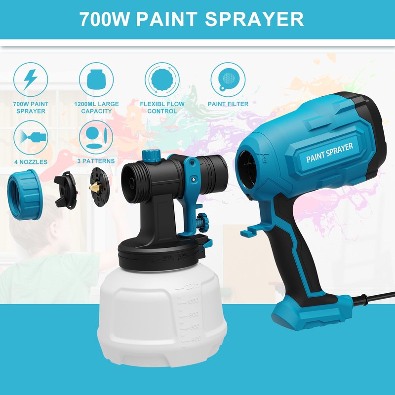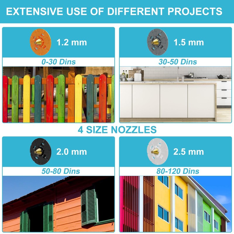 - 【4 Nozzle Sizes and 3 Spray Patterns】WIBENTL 700W paint sprayer can be adjusted to 3 different spray patterns: horizontal, vertical and circular, and is equipped with 4 sizes of nozzles (1.2mm, 1.5mm, 2.0mm, 2.5mm ), suitable for a variety of spraying projects, such as furniture, cabinets, doors, walls, garden chairs, etc
