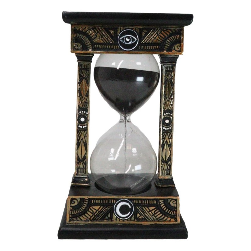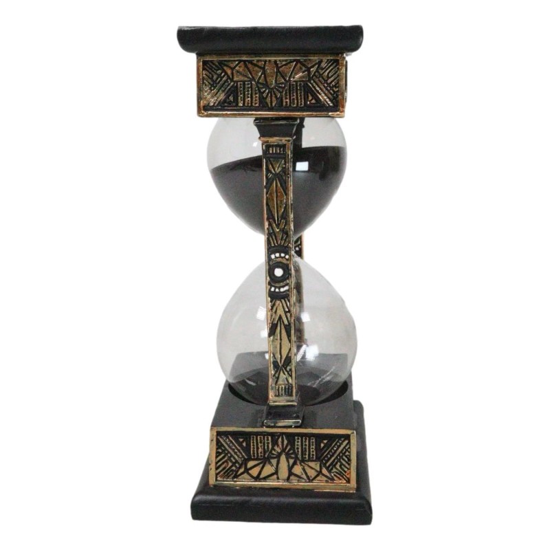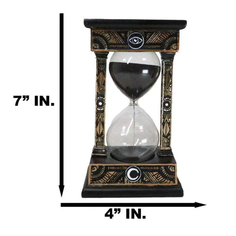 • This Mystic Sand Timer Sculpture is made of designer composite resin, hand painted and polished individually. The sands in the glass column are black in color.