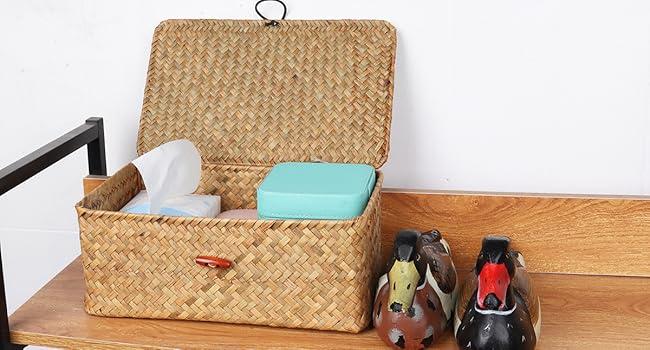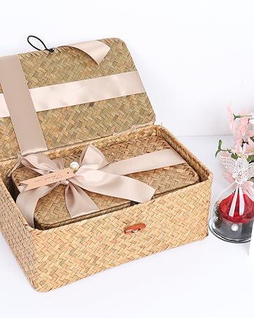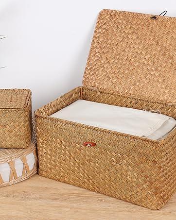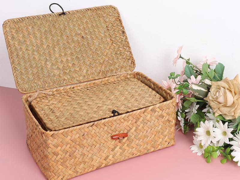 Wicker Shelf Baskets with Lid,Handwoven Seagrass Basket for Storage Basket Bins Rectangular Home Organizer Gift Boxes (Natural Small) - Color: Natural Small