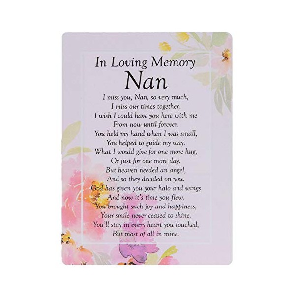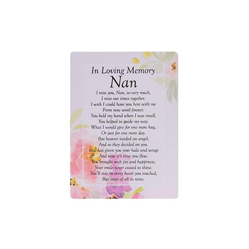 A sweet and heartfelt graveside poem card - Delicate watercolour floral design - Weatherproof - Display at the graveside - Size: 16.5cm x 12cm - Space on the back to write a message - The Card Reads: In Loving Memory Nan I miss you, Nan, so very much, I miss our times together. I wish I could have you here with me from now until forever. You held my hand when I was small, you helped to guide my way. What I would give for one more hug, or just for one more day. But heaven needed an angel, and so they decided on you. God has given you your halo and wings and now it’s time you flew. You bought such joy and happiness, your smile never ceased to shine. You’ll stay in every heart you touched, but most of all in mine.