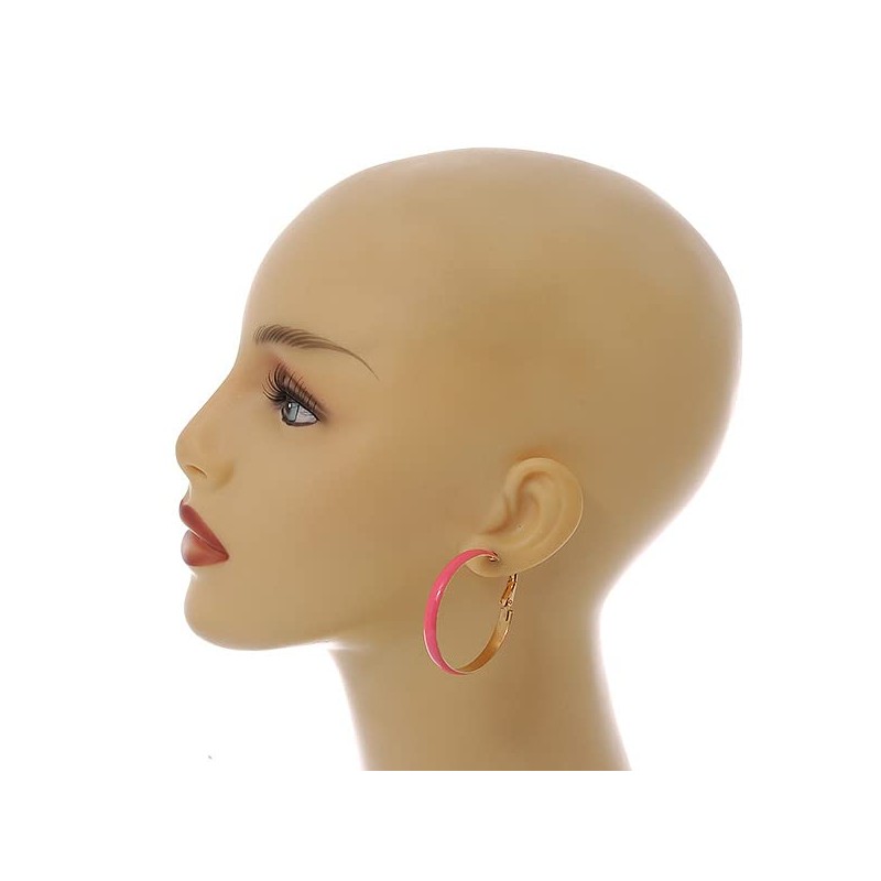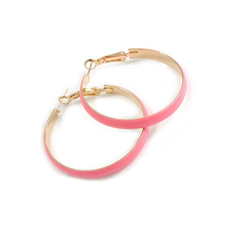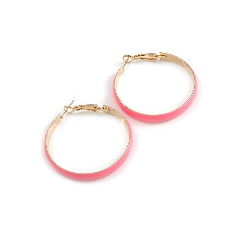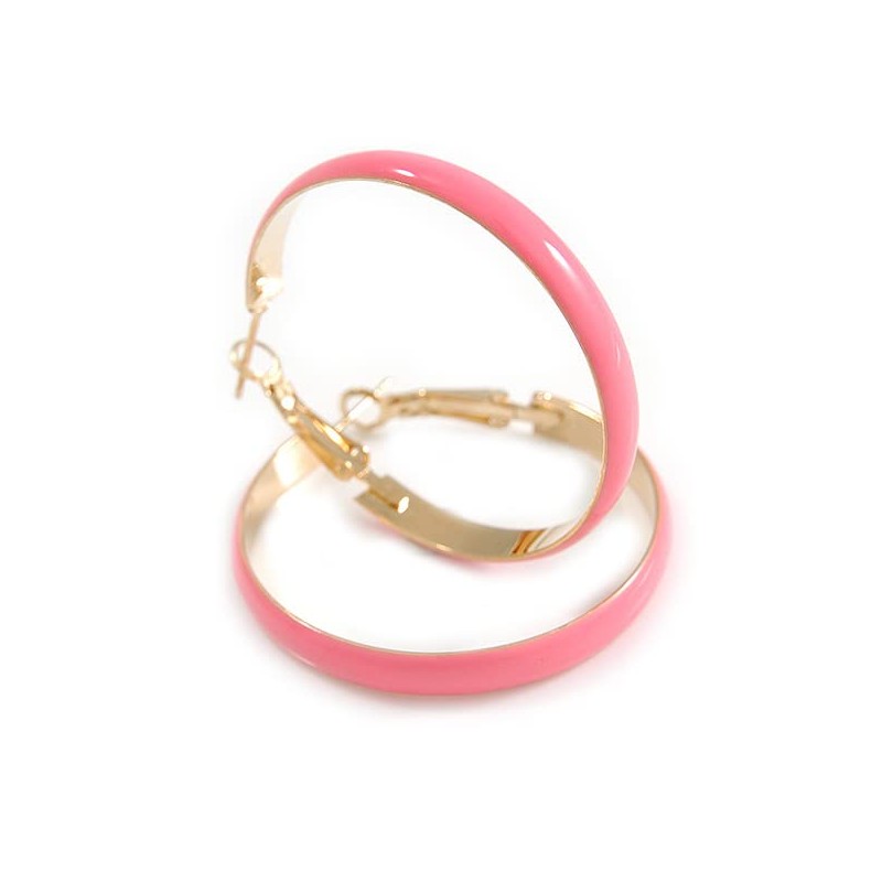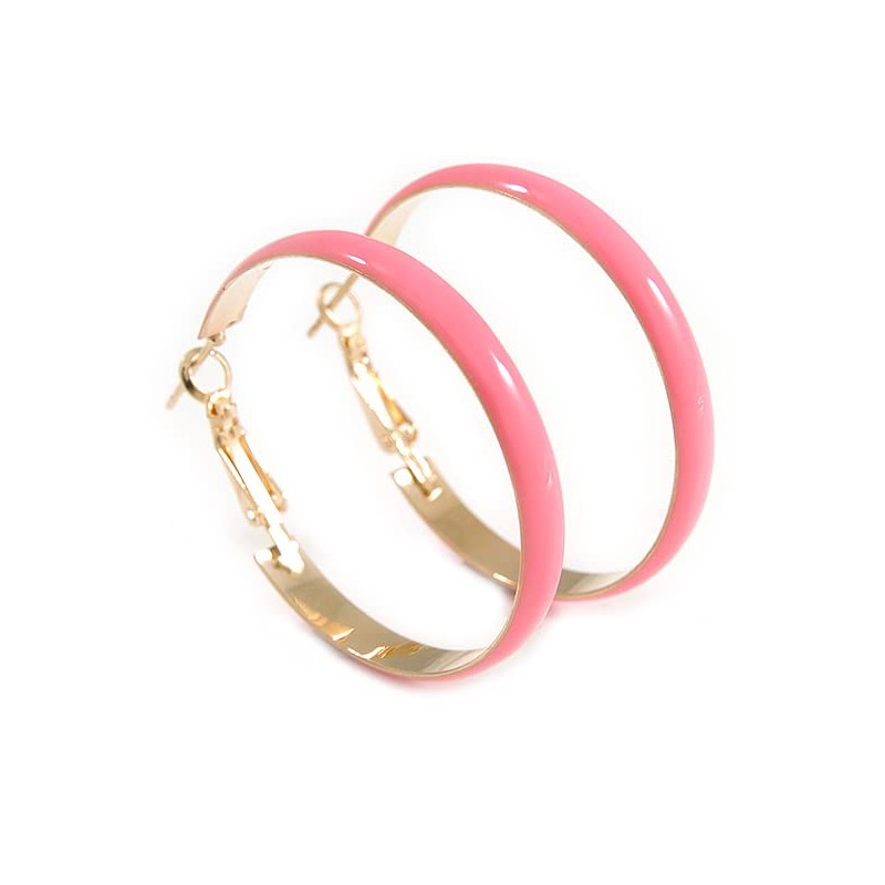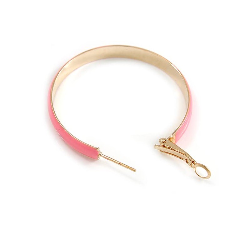 Wide Pink Enamel Hoop Earrings In Gold Tone/Medium Size/40mm D