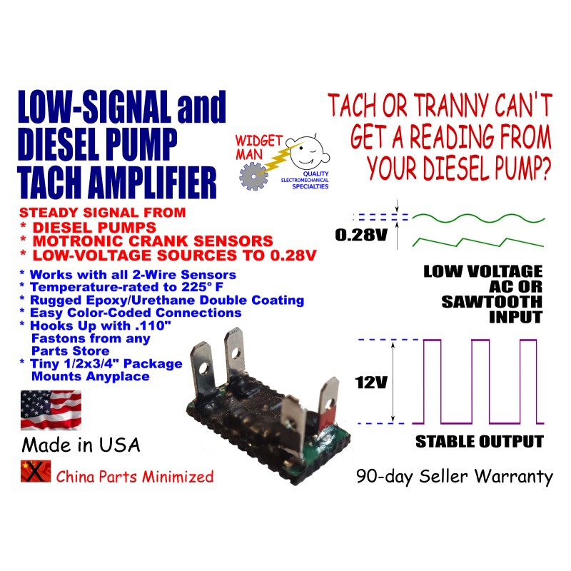 GM/Stanadyne, Isuzu and Mercedes diesel pumps all put out ridiculously low signal voltages at idle, sometimes down to half a volt.   So do many 2-wire Motronic crankshaft sensors.  Some speedometer/VSS sensors that aren't amplified with magnets put out equally tiny voltages at low vehicle speeds.  This small but mighty device can solve all those problems.  It can amplify AC or sawtooth waves from any weak 2-wire sensor into a clean 12V square wave usable by any typical tach or ECU.  It will trigger at an astonishing 0.28V, detecting signals far too small for even a sensitive transistor.  It's the size of a nickel and needs only 4 connections (power, ground, signal-in and signal-out) with .110" faston connectors from any parts store.  Connections are color-coded for easy hookup, plus it's double-sealed with vinyl over epoxy for IP67 weatherproofing, vibration-proof, and withstands temperatures to 225F.  So it's perfectly comfortable living in your engine box, or even taped inside a harness.  It comes with a 90-day warranty plus free email tech support if you need it.