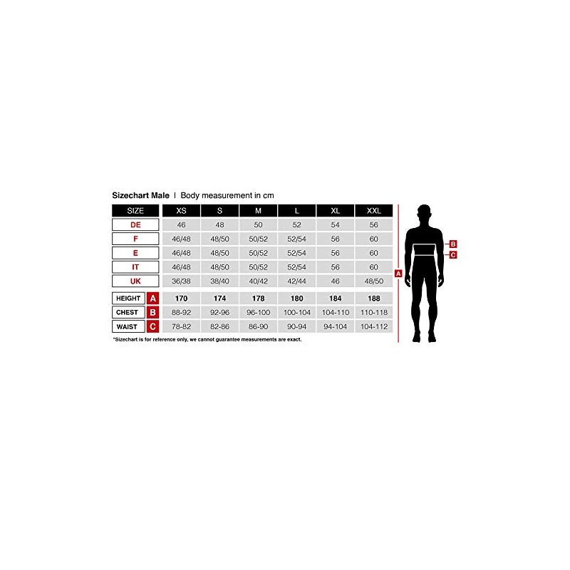 Large UK 42-44; Eur 52-54; Chest 106-111cm; Waist 91-96cm