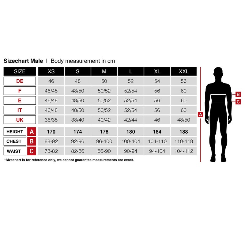 Medium UK 40-42; Eur 50-52; Chest 101-106cm; Waist 86-91cm