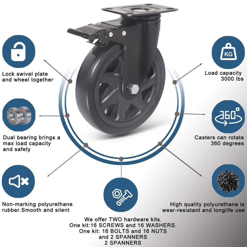 - Lockable Caster Wheels Heavy Duty6 inch cart wheels equipped with double brake, holding the equipment firmly in place to reduce accidents. This combination wheel brake and swivel lock is essential for safety in some applications, such as on worktables, table saws, medical equipment, and used on uneven floors.